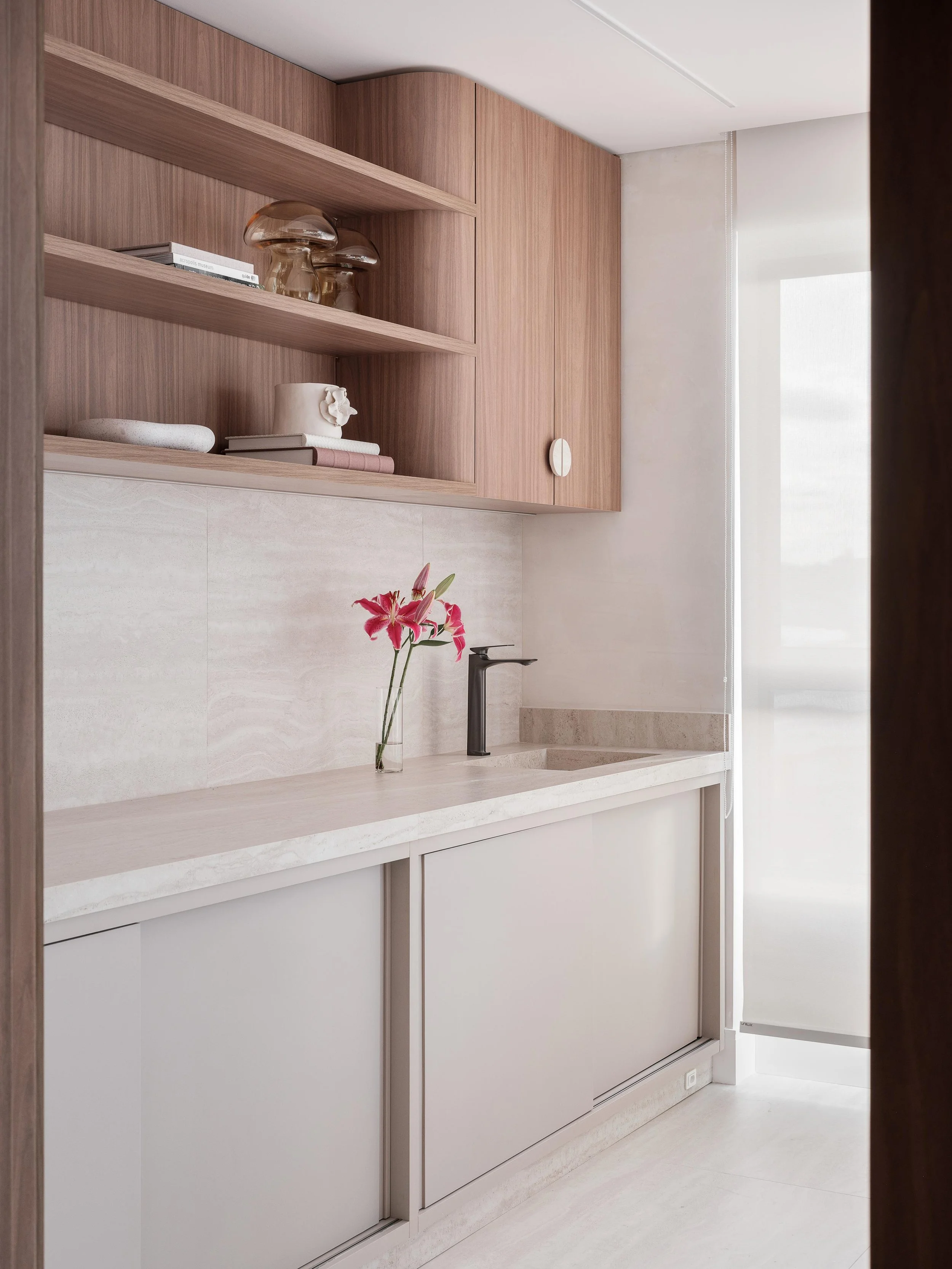 O ambiente traduz leveza e serenidade, com mobiliário cuidadosamente escolhido e acabamentos que evocam conforto e elegância.