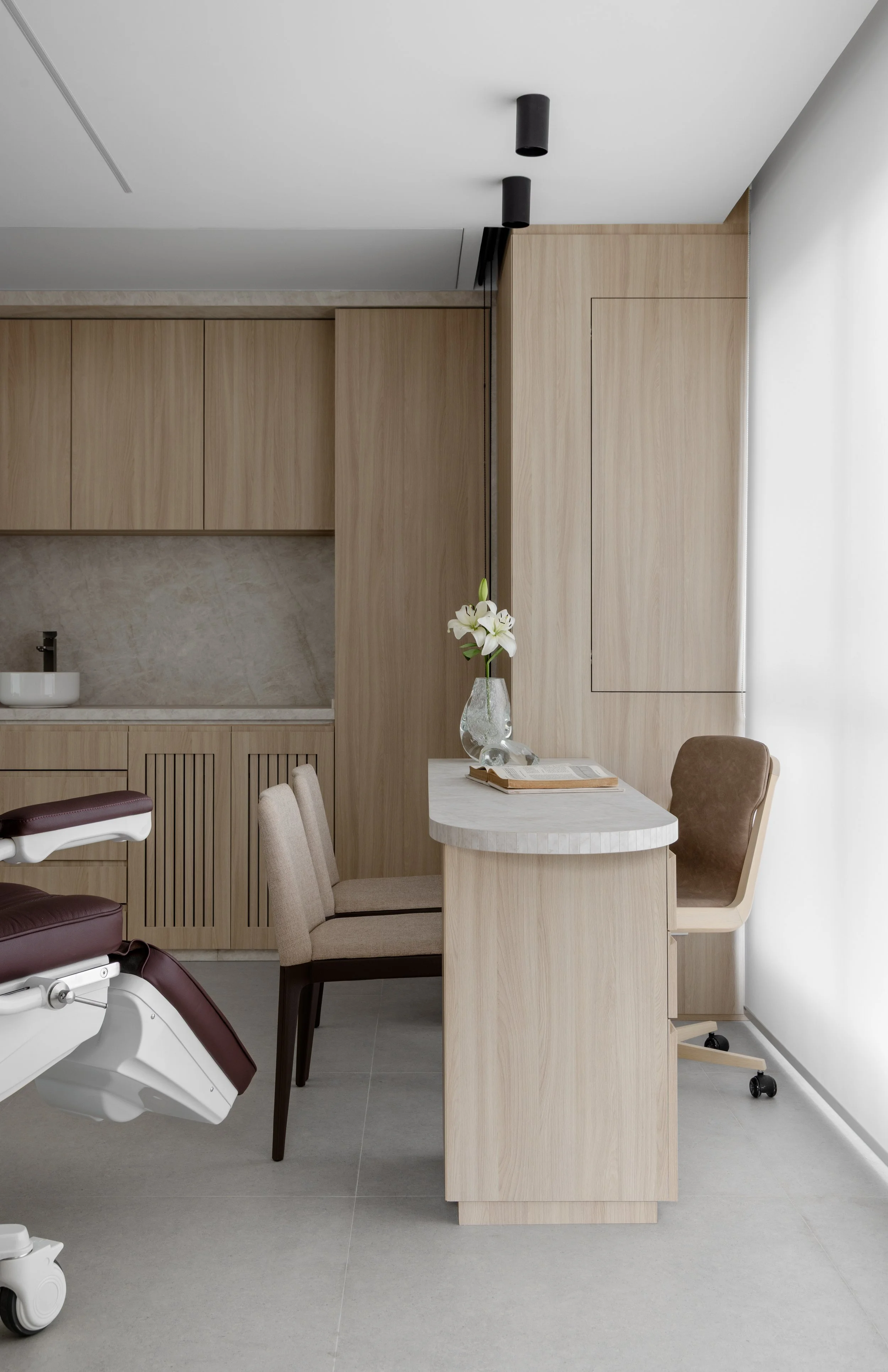 Para contrapor a neutralidade da base, o mobiliário incorpora tons mais profundos e terrosos, introduzindo contraste e elegância sem romper a unidade do conjunto. O resultado é um ambiente fluido, sofisticado e humano, onde cada detalhe contribui para uma experiência de atendimento mais tranquila e qualificada.
